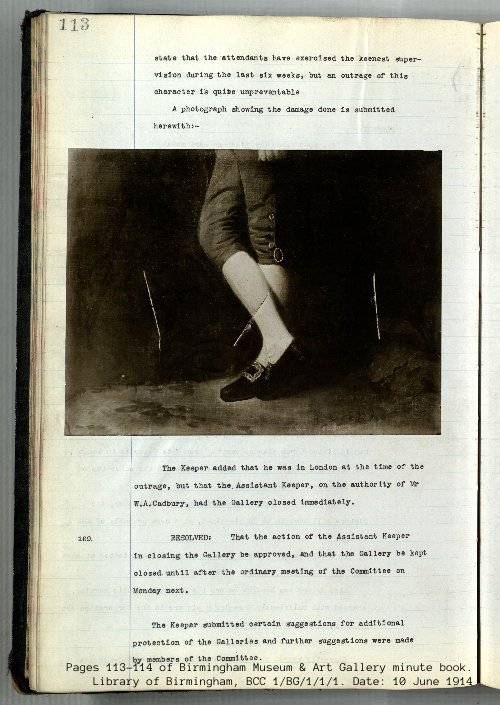 Her most famous act of protest occurred on 9th June 1914, when she entered Birmingham Art Gallery and slashed George Romney’s painting, ‘Master Thornhill’, three times with a meat cleaver that she had hidden in her jacket. She had with her a note explaining her actions as a protest against the government’s refusal to grant women the vote and their cruel treatment of suffragette prisoners. This act caused £50 worth of damage and led to her re-arrest and another hunger strike in Winson Green.