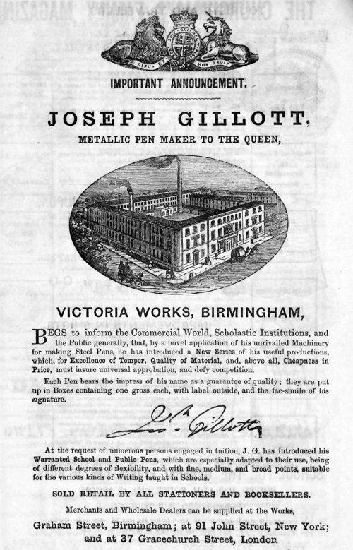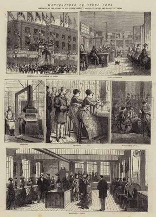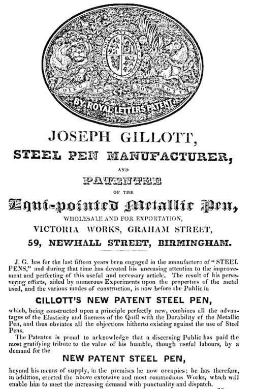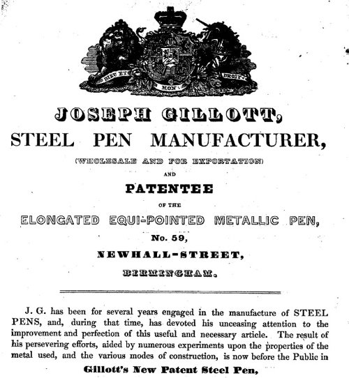 Born in Sheffield, Yorkshire, in 1799, the son of a knife cutler, Gillott’s early life was immersed in the metal trades.  He moved to Birmingham around 1820, initially working as a journeyman toolmaker, specialising in buckles and small steel toys. It was while working in the buckle trade that he began to experiment with improving the crude, expensive, and often unsatisfactory quill pens or the nascent steel pens of the era. Prior to his innovations, steel pens were laboriously made by hand, limiting their availability and affordability.