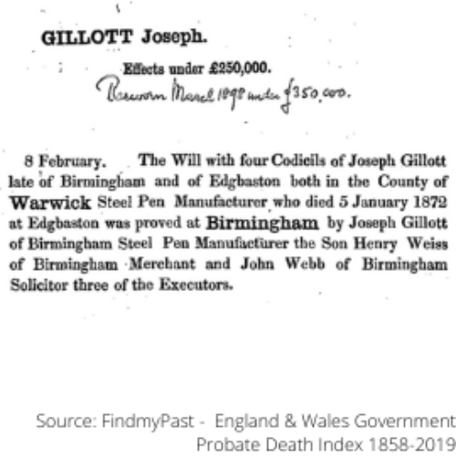Joseph Gillott died in Edgbaston, Birmingham, on 5th January 1872, leaving behind a vast fortune and a legacy that extended far beyond his wealth. He is buried in Key Hill Cemetery. His ingenuity democratised writing, making literacy more widespread, and established Birmingham as the “Pen Capital of the World.”