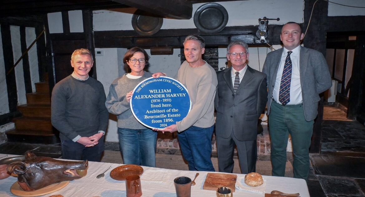The Birmingham Civic Society – Blue Plaque unveiling took place on November 14th, 2024 to honour the life and work of architect William Alexander Harvey. Unveiled at Minworth Greaves, Bournville, the event was a celebration of Harvey’s lasting influence on the city and beyond. Harvey, a pioneering architect and planner, best known for his role in shaping the Bournville Estate, one of the UK’s most admired examples of garden city planning, and his vision for affordable, quality housing for the workers at the Cadbury Brothers’ Bournville chocolate factory. Harvey’s vision and creativity was to become a legacy of one of the most admired and attractive suburbs in the city of Birmingham.