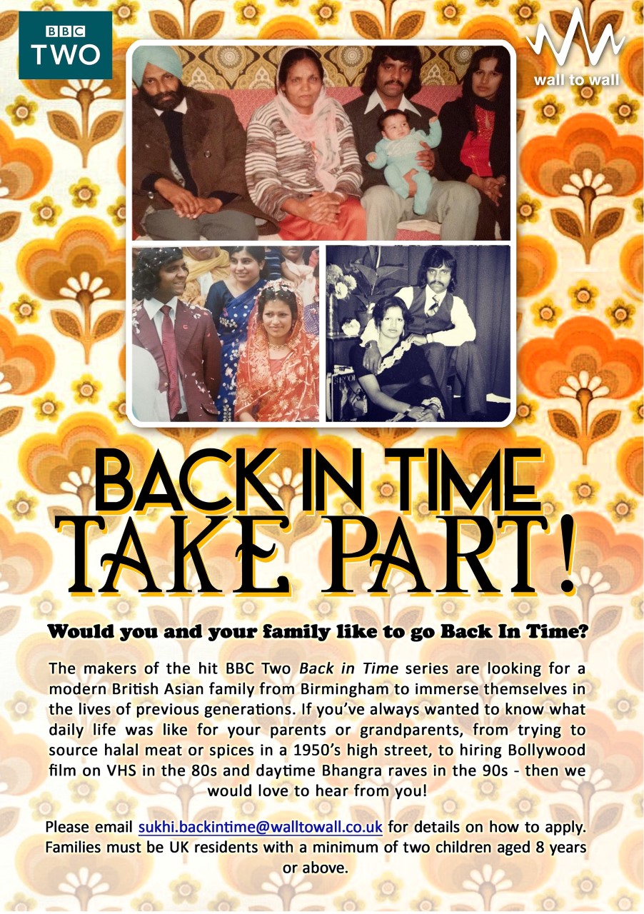 The BBC2 Living History Series – “Back in Time…” is casting for the new series in Birmingham and is looking for a fun Modern British Asian family who live in Birmingham or the West Midlands and would be up for this exciting, once in a lifetime experience which will immerse them in the life that their parents and grandparents would have lived from the 1950’s through 5 decades to the 90’s. Families must be UK residents with a minimum of two children aged 8 years or above.